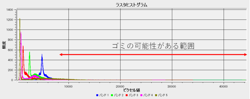 衛星画像のヒストグラムを見ると「10000~最大」の部分と「0~1000」くらいの部分はゴミ画素として扱ってしまって問題ないことが分かります。