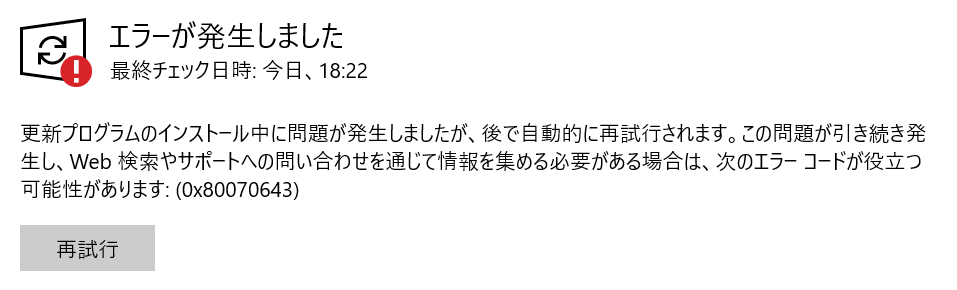 更新プログラムのインストール中に問題が発生しましたが、後で自動的に再試行されます。この問題が引き続き発生し、Web 検索やサポートへの問い合わせを通じて情報を集める必要がある場合は、次のエラー コードが役立つ可能性があります: (0x80070643)