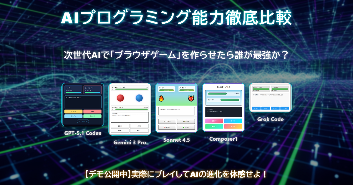 今回は、「1つのHTMLファイルだけで動く、ポケモン風バトルゲームを作って」という同一のプロンプトを、最新・未公開を含む5つの生成AIに投げかけ、そのコーディング能力とセンスを徹底比較しました。