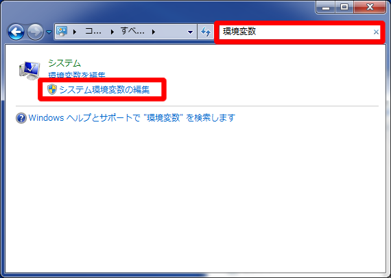 「コントロールパネル」で「環境変数」を検索し「システム環境変数の編集」を選択します。