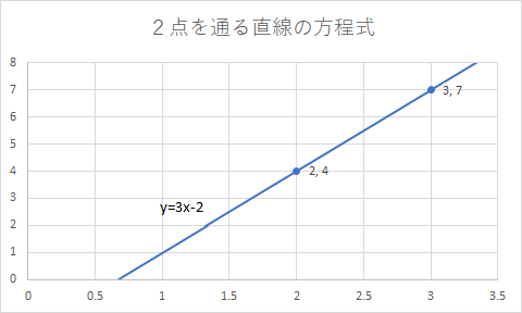 y軸にもx軸にも平行ではない場合(2, 4)と(3, 7)を通る直線