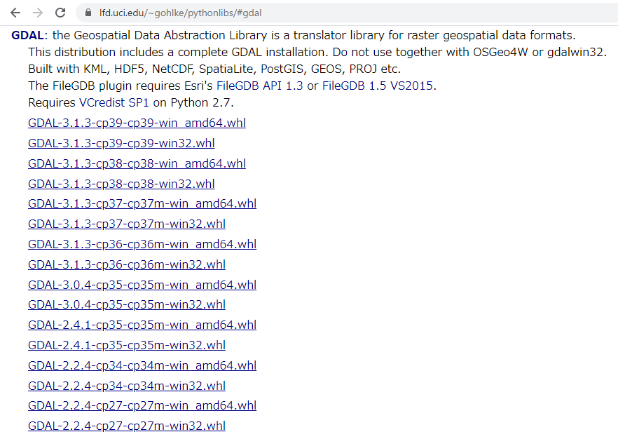 つぎに下記のサイトからインストールしたいGDALのwhlファイルをダウンロードします。